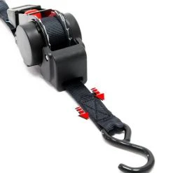 Une courroie d‘arrimage avec mécanisme de rétraction peut s‘avérer d‘une grande aide surtout si l’usage est simple. Dans ce modèle, la sangle ne doit pas être enfilée. Une fois que le levier est retenu derrière le cliquet d‘arrêt, la sangle se détache et se déroule. Si vous maniez à ce moment le bouton rouge, la sangle s‘enroulera à nouveau. Le rôle du cliquet étant de générer une pression, aucune autre forme de force ne sera nécessaire pour cette manipulation.
