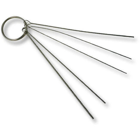 Ce kit de nettoyage est composé de 6 aiguilles de nettoyage de haute qualité en acier inox tordu avec anneau de clés – il convient très bien au nettoyage des ouvertures les plus petites comme par exemple les buses fines des aérographes. Le fil en acier tordu donne aux aiguilles la stabilité voulue et les particules de saleté peuvent être enlevées facilement grâce aux spirales. Les fils de nettoyage ont été ébavurés à leur bout coupé.