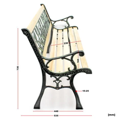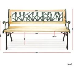 | Application / Information / Caractéristiques | Dossier Intérieur en motif de tulipes Bras en fer de fonte massif Dossier intérieur en plastique Lattes en bois robuste et laqué |