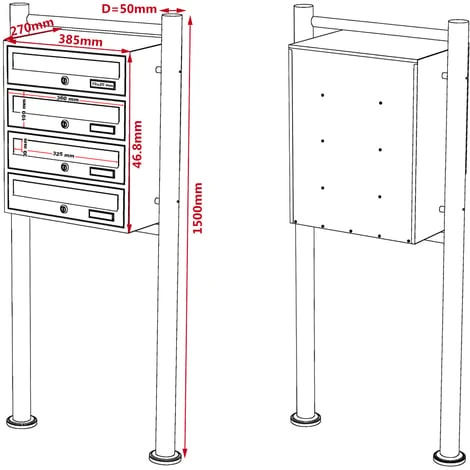| Dimensions | Dimensions par compartiment: 360 x 270 x 100mm Dimensions fente à lettres: 325 x 30mm Dimensions de la boite aux lettres: 468 x 385 x 270mm Dimensions du support : 1200 x Ø 50mm / 78mm |