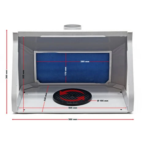 | Dimensions | Ouvrir: 480 x 560 x 360 mm Fermé: 270 x 560 x 360 mm Cubicule: 505 x 325 x 330 mm Dimensions du filtre: 385 x 170 mm Plaque pivotante Ø: 195 mm |