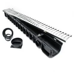 Vous pouvez enfoncer complètement le caniveau dans le sol, de sorte à ce que seule la grille antidérapante ornée d’un profil reste clairement visible. Le caniveau se caractérise par une robustesse et une longévité particulières grâce à sa fabrication en plastique de haute qualité et à la grille en acier galvanisé. Vous pouvez effectuer le raccordement au système d’eaux usées via un tube standard KG / DN110. Vous recevrez à cet effet deux embouts pour l’installation directe sur place.