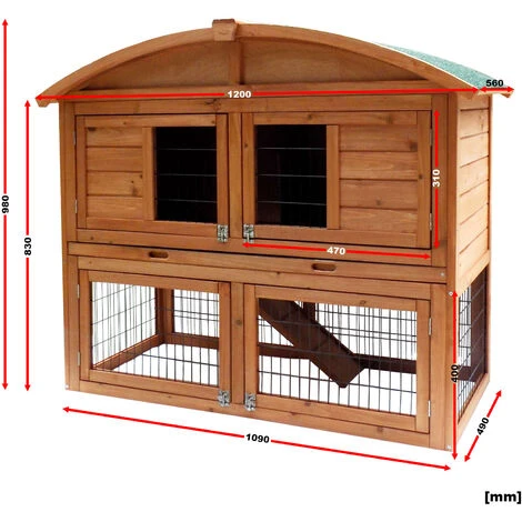 Avec des dimensions totales de 1200 x 560 x 980 mm, fabriquĂ© en bois d’Ă©picĂ©a, le clapier pour petits animaux se caractĂ©rise par sa rĂ©sistance aux intempĂ©ries. De conception intelligente, les animaux peuvent accĂ©der au dortoir en haut en utilisant la rampe, qui relie l’abri Ă l’enclos en bas. Le toit est colmatĂ© avec du bitume, ce qui protège l’intĂ©rieur de la maisonnette de l’humiditĂ©.