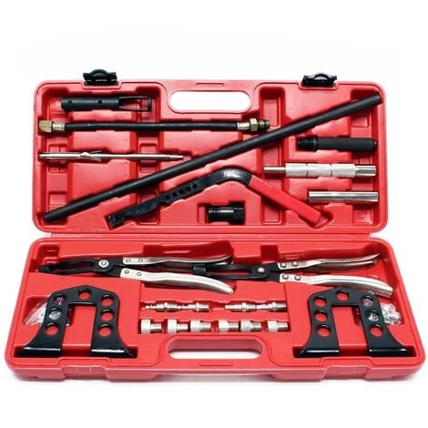 L‘ensemble convient à tous les moteurs à essence ou diesel OHC et OHV de 8, 16 et 24 soupapes et convient pour extraire les joints de soupape des moteurs avec arbre à cames. Par ailleurs, les adaptateurs et les poignées ont l‘avantage d‘être munis d‘extrémités moletées ; ce qui permet de retirer les soupapes en douceur et sans risques de les endommager. Par ailleurs, la pince magnétique facilite le montage et le démontage des clavettes demi-cônes.