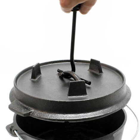 Devenue une référence dans le monde des arts de la table, la marmite est idéale pour préparer des mets différents : de la viande tendre et des légumes savoureux au pain rustique ou aux gâteaux succulents. La marmite se chauffe au charbon, aux briquettes ou directement au bois. La forme solide en fonte permet une bonne répartition de la chaleur pour une cuisson uniforme. Attention : en raison de la conduction thermique, le couvercle absorbe également la chaleur et ne doit pas être touché à main nue. Pour lever le couvercle en toute sécurité, la marmite est équipée d’un lève-couvercle. En outre, le couvercle est doté d’un rebord surélevé afin de pouvoir y placer davantage de braises ou de charbons. Pour le stockage, nous recommandons de graisser la marmite, de placer une feuille de papier absorbant à l’intérieur et de ne pas fermer complètement le couvercle.