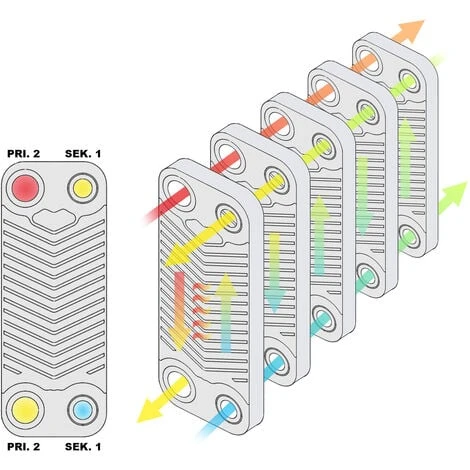 Les HRALE Ă©changeurs de chaleur inox B3-12-30 soudĂ©s se composent de plaques inox imprimĂ©es qui sont brasĂ©es sous vide au cuivre. En les assemblant, une plaque sur deux est tournĂ©e Ă 180 degrĂ©s ce qui permet de crĂ©er deux espaces en sens contraire l’un de l’autre, dans lesquels les fluides passent en contre-courant. La surface imprimĂ©e ondulĂ©e des plaques produit un flux turbulent ce qui entraĂ®ne une transmission effective de la chaleur mĂŞme Ă des volumes très faibles de flux.