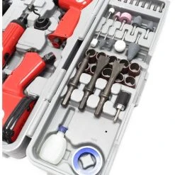 Un ensemble de 71 pièces qui contient différents outils pneumatiques, une clé à chocs de 1/2″, un marteau pneumatique burineur de 150 mm, une meuleuse droite et un tournevis à cliquet de 3/8″. Le set comprend également de nombreux accessoires se relatant aux outils pneumatiques, comme les douilles, les raccords de meulage et différentes vannes. Le raccordement à l‘air comprimé s‘effectue via un raccord rapide, ce qui facilite largement les conditions de travail et en augmente l‘efficacité. Tous les embouts se remplacent rapidement. Il s‘agit, en somme d‘un outil qui peut être utilisé professionnellement dans différents secteurs : atelier, agriculture et industrie. Vous pouvez l‘utiliser aussi pour un usage personnel dans le domaine de vos passe-temps et loisirs. L‘ensemble est emballé de manière sûre et compacte dans un coffret en plastique.