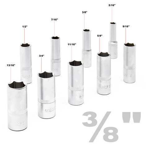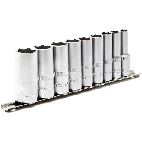 Ce jeu contenant 9 différentes douilles impériales avec un entraînement de 3/8 pouce (9,5 mm) et une longueur de 63 mm. Les douilles sont en acier au chrome vanadium avec une finition satinée et sont donc extrêmement robustes.
