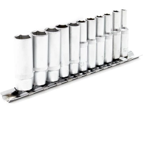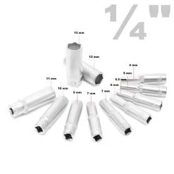Ce jeu contenant 11 douilles métriques avec un entraînement de 1/4 pouce (6,35mm) et une longueur de 50 mm. Les douilles sont en acier au chrome vanadium avec une finition satinée et sont donc extrêmement robustes.