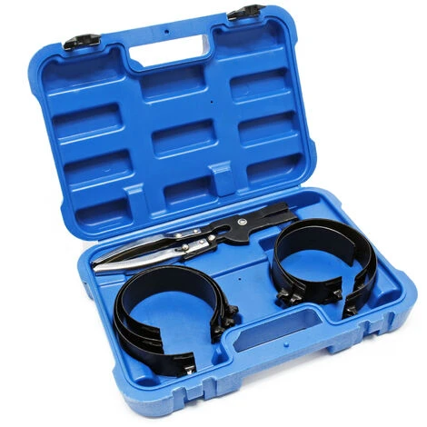 Un jeu se composant de compresseurs de segments pour vous aider à insérer les pistons sans les endommager. Pour ce faire, les compresseurs se pressent ensemble avec le cliquet à fermeture au niveau de l‘assemblage. Par ce biais, vous pouvez insérer le piston dans le cylindre en toute facilité. L‘ensemble comprend 6 colliers de serrage ainsi qu‘une pince de serrage.