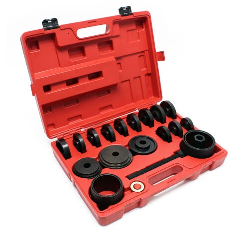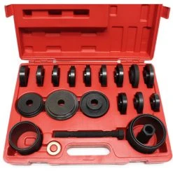 Nous fournissons un kit d’outils de 24 pièces pour l’extraction des roulements. Grâce à cet outil, vous pouvez remplacer le roulement sans démonter la jambe de suspension ! Vous pouvez utiliser ce kit d’outils pour enlever les roulements de la plupart des véhicules avec traction avant.