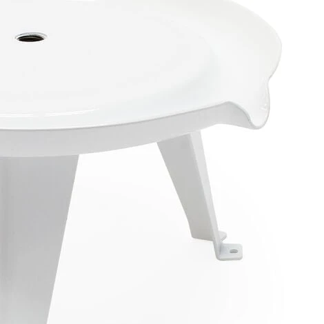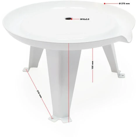 Un support en fonte robuste peint en blanc et ayant un diamètre de 275 mm. La hauteur est de 150 mm et l’espacement des trous des pieds est de 210 mm. Le support convient pour une broche de M16x2.0.