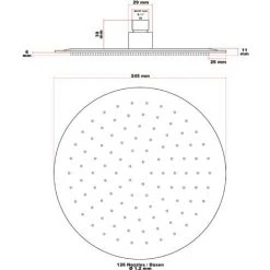 | Dimensions | Hauteur: 0,7 mm Raccordement : 20,67 mm (G 1/2″) IT Diamètre : 245 mm Nombre de buses : 126 Diamètre des buses : 1,2 mm Dimensions avec raccordement : 245 x 245 x 245 x 50 mm |