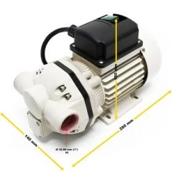 Une pompe à membrane auto aspirante avec une tension de moteur de 230 volts, une puissance de débit de 40 litres la minute, la hauteur d’aspiration est 5 m, la hauteur de débit est 15 m. La pression de travail maximale est de 2,8 bars