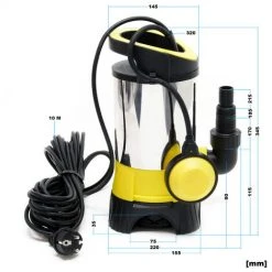 D’une puissance de 750 watts, la pompe peut débiter jusqu’à 13 000 litres d’eau sale par heure à une profondeur d’immersion maximale de 7 mètres. La hauteur de débit maximale est de 9 mètres. Par ailleurs, le moteur de la pompe est équipé d’une protection contre les surcharges.