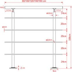 | Dimensions | Longueur: 180 cm Hauteur: 106 cm Main courante Ø: 42 mm Traversières Ø 10 mm Distance des supports de sol: 151 cm Hauteur du support de sol: 102,5 cm Dispositifs de fixation |