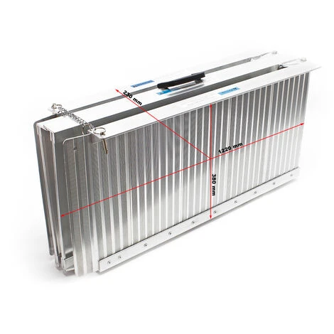 La rampe peut être facilement pliée dans le sens der la longueur grâce à une poignée et portée facilement par un propre poids de 21,2 kg seulement . La rampe dispose d’une capacité de charge de 270 kg. Grâce à son maniabilité facile et domaine d’utilisation flexible , cette rampe vous convaincra très rapidement.