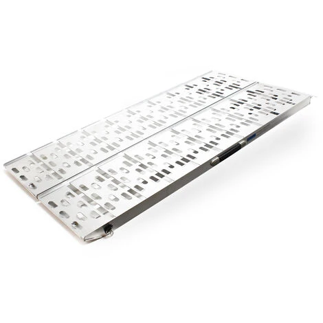 La rampe peut être facilement pliée dans le sens der la longueur grâce à une poignée et portée facilement par un propre poids de 11 kg seulement . La rampe dispose d’une capacité de charge de 270 kg. Grâce à son maniabilité facile et domaine d’utilisation flexible , cette rampe vous convaincra très rapidement.