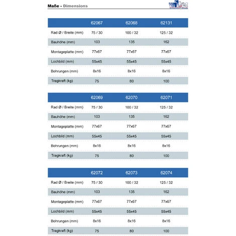 Le diamètre de la roue est de 100 mm. La plaque robuste qui surplombe la roue de 77 x 67 mm, se visse simplement sur la charge qui doit être transportée, au moyen des orifices préfabriqués.