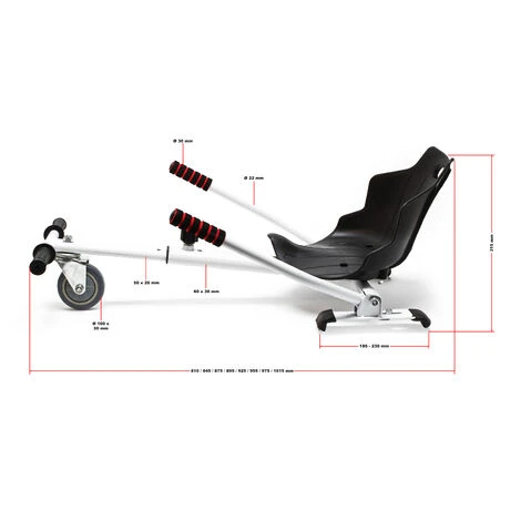 Le siège du kart est compatible avec tous les balance scooters (Hoverboard) courants de 16,5 cm (6,5″), 20,3 cm (8″) et 25,4 cm (10″) et supporte une charge totale jusqu’à 120 kg grâce à son châssis robuste en acier. La planche peut être transformée en scooter en quelques étapes simples.