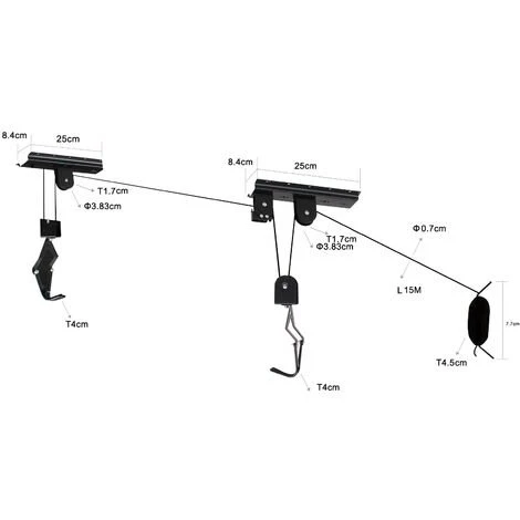 | Application / Information / Caractéristiques | Ascenseur pour vélos pour toutes les tailles de vélo Crochets avec revêtement en caoutchouc Hauteur max. du plafond 4 m |