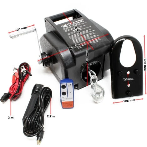 | Accessoires | 1 x Treuil à câble 1 x Interrupteur de traction du câble 1 x Télécommande 1 x Manivelle 1 x Plaque de montage 1 x Câble de batterie |