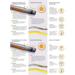 Le tuyau de la série SMARTFLEX SMT Comfort est recouvert d‘une couche extérieure très lisse et robuste qui le protège des influences extérieures et lui assure de ce fait une longue durée de vie. La couche suivante est celle qu‘on appelle la » Steaday Mesh Technologie » (SMT), et qui porte bien son nom MESH puisqu‘elle est constituée d‘un mixage réussi du procédé de tricotage et d‘un tissage croisé. Résulat : le tuyau garantit stabilité et flexibilité constante même sous pression. Là où d‘autres tuyaux se tordent et se plient sous une forte pression d‘eau et empêche l‘écoulement, le SMARTFLEX SMT résiste à l‘emmêlement, aux torsions et étranglements. Quant à la troisième couche, elle agit comme un dispositif de renfort et garantit encore plus de renfort et robustesse.